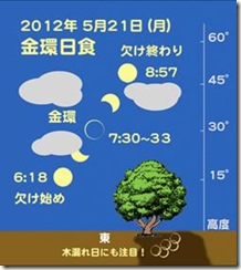 「こりゃ、だめだ。日食は見れりゃへんわ。」・・・朝、曇り空を恨めしげに眺めた方も多かったと思います。ところが、どっこい、金環日食の始まる間際になると、なんと雲が切れ青空が広がってくるではありませんか。まさに天はわれらの味方です。(穂澄くんの日記にはテルテル坊主を作って祈ったことが書かれていました。)