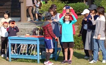 に月がすっぽりと納まると、あたりも少し暗くなり…「わ~、すごい!!」。子どもからも大人からも歓声があがりました。