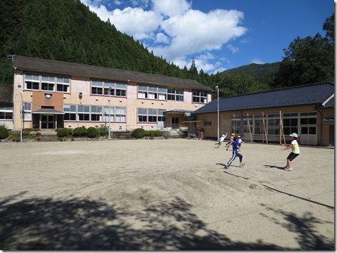 三都橋小学校は閉校後、地区のグランドゴルフの練習場になっているらしく、運動場はていねいに整地され、施錠もされていました。そこで、近所の方に立ち入りの許しを得に行ったところ、「田峯の子んたちかい。子どもの声がすると私らも楽しくなるで、遊んでっておくれん」と大歓迎の言葉が返ってきました。そこで、「大きな声を出して遊ぶ」ことを目当てに、たっぷりと遊び廻り、学校を後にしました。