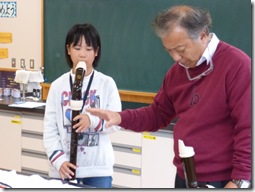 この日は、20数本の様々なリコーダーを準備し、音色の違いや演奏の仕方を子どもにていねいに伝授して下さいました。そして、コンサートの中では、子ども達と一緒に「茶色の小びん」(町音楽祭での発表曲の一つ)を一緒に合奏するなど、リコーダーの魅力を存分に味わわせてくださいました。そして、「こんなにリコーダーの上手な小学生は出会ったことがない」と、子どもたちの演奏にお墨付きをいただきました。もちろん、もっと上達するための課題もたくさんいただきました。
