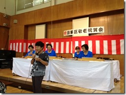敬老の日の日中、改善センターを会場に、区の敬老会が開催され、学校もお招きを受けました。95才の林さんを筆頭に、区内から総勢56名のお年寄りがおそろいでした。