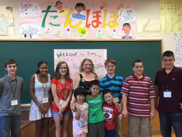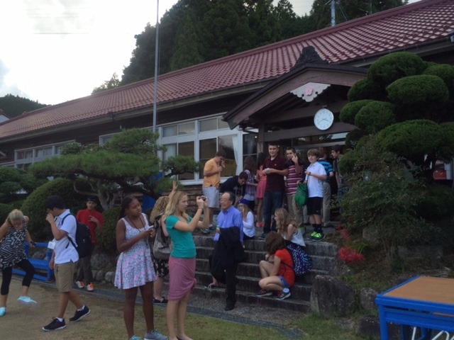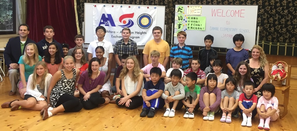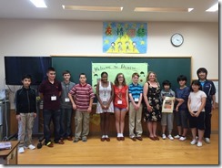 設楽中学校・津具中学校の生徒との交流・ホームステイ等の体験のため来日したアーリントンハイツの中学生19名が、設楽町での最初の訪問地として、本校に寄ってくれました。