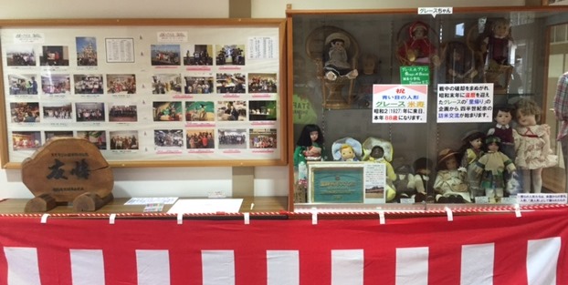 本年88歳の米寿となる「青い目の人形・グレースちゃん」に関する情報をまとめ、答礼人形・孫人形とともに公開しています。中央玄関両側に掲げた「訪米記録写真額」にも、四半世紀にわたる歴史の足跡をじっくりと見つめる人の姿が・・・