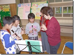 11時から、中・高学年は、一旦、学校の講堂に集合し、午後に出演する「バルネロ・ムジーク・コンソート」(新城市)さんとのリコーダー演奏(田峯城でのミニコンサート)のリハーサルに臨みました。