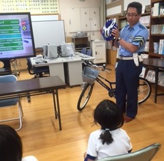 前半の講話で、おまわりさんに上映していただいたミニ映画では、小学生が重大な事故の加害者となる可能性についても描かれており、子どもたちもそれぞれ、引き締まった表情で見つめていました。