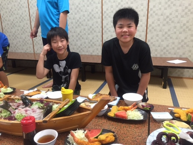 初めてのシーカヤック体験と、ほんの少しの水泳実習(実はだんだん体が冷えてきましたので…)を楽しんだ後は、またまたごちそうタイム!!今夜のメイン、ハマチとアイの舟盛りと、タコがどどーんと登場したのでした!!