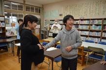 設楽町と田峯区は、以前から淑徳大学と交流がありました。田峯区では、先日の「だみね城まつり」にも協力してもらいました。今回、大人との交流ではなく、子どもとの交流をメインに行いたいということで、中学年と交流することになりました。事打合せの後、6限目に、自己紹介、フルーツバスケット、木のキーホルダー作りを行いました。顔合わせでは、元気なあいさつが響いていました。フルーツバスケットでは、児童、大学生ともだんだんに雰囲気に慣れ、楽しく過ごしました。キーホルダー作りでは、材料に「杉」と「桧」の二つを用意してくれました。匂いで嗅ぎ分けようとしましたが、なかなか判断が難しいようでした。サンドペーパーで面をきれいにし、紐をつけてキーホルダーが出来上がりました。子どもたちは思い思いのキーホルダーを手にしてうれしそうでした。楽しく過ごすことができ、よい交流となりました。
