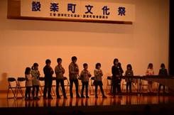 交流会におきまして、田峯小PTAが優良家庭教育推進組織顕彰を受けました。PTAが地域との橋渡し役となり、地域で子どもを育てている活動の様子を、田峯小PTA会長さんが代表して発表しました。最初に田峯観音奉納歌舞伎の子供歌舞伎のビデオを見ていただき、その後で地区の伝統行事・田峯観音奉納歌舞伎への取組の様子、伝統産業である茶摘みの親子活動や茶業組合との連携の様子、地域の環境を生かし、地域の方に講師をしていただいたビオトープ活動、PTAが地域に働きかけて行っている絵本の読み聞かせ活動などを具体的に説明しました。その後の指導講評や記念講演の講師の方の話の中で、地域の中の子育ての様子をほめていただきました。愛知県教育委員会より会長さんに感謝状が渡されました。