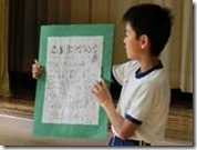 低学年の算数では、釣った魚の大きさを調べました。それぞれの考え方を発表しました。きちんと説明できたのがとてもよいです。3人で発表している様子がとてもよいです。いろいろな考え方や説明の仕方に触れることで、自分の思考力の幅を広げられると思います。
