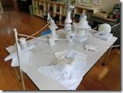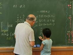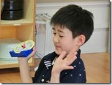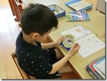 1年生は、算数のまとめの問題に取り組みましたが、時計の読み方も学習したということで、こちらで言う時間をセットしてくれるということになりました。いくつかの時間をリクエストすると、どれもきちんと模型の時計で示してくれました。最後に、現在の時刻9時55分も示してくれました。
