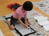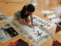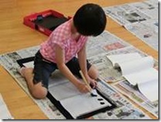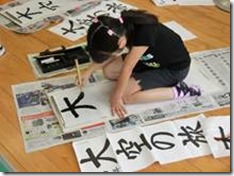 中学年は書写で条福紙を使って取り組みました。紙がかなり大きく感じましたが、床において一文字ずつ丁寧に書きました。体が柔らかいので、床の上でも無理なく書いていました。