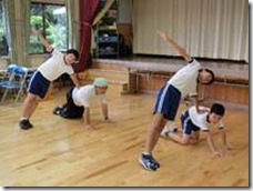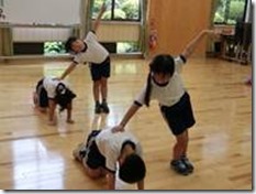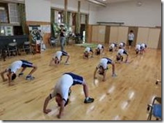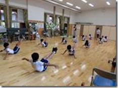 高学年は体育を行い、リズム運動・体つくり運動を行いました。