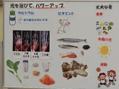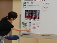名倉小の栄養教諭・原田先生が、巡回栄養指導に来てくださいました。給食の準備の様子、会食の様子、片付けの様子を見ていただいた後で、ひかりと栄養について、お話をしていただきました。じょうぶな骨を作るためには、カルシウムやビタミンDの摂取が必要だそうです。そのために牛乳や魚など、食べるとよい食品を教えてくださいました。該当する食品がクイズ形式のように登場するので、子どもたちも、自分の思いつく食品を口々に発表しました。とてもよい反応で、楽しくお話が進んでいきました。また、じょうぶな骨を作るために、食事以外にも、太陽の光を浴びて、しっかり運動することでビタミンDを体内で作ることができるということでした。今学校で取り組んでいるひかりをあびる活動のよさを栄養指導でも知ることができました。昔の子どもが丈夫だったのも、こうしたことが大きく影響していることを改めて感じました。今の子どもたちにも、しっかりと外で遊んでほしいと思います。外遊びで体を動かすことは、自分の動きを高めたり、運動神経を高めたりすることにも役立ちます。今日はよい話が聞けました。