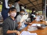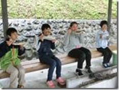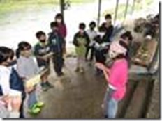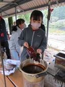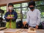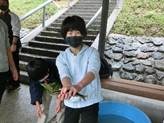 その後、川沿いにある八雲苑さんに行き、鮎の串打ちと五平餅づくりの体験をしました。鮎つかみは、簗でつかみ取り体験の予定でしたが、あいにくの雨で、たらいの中でつかみ取りをさせていただき、その鮎に自分で串を打ち、塩を振り、あとで塩焼きにして食べました。五平餅も木枠に合わせてご飯を押し込み作りました。出来あがった料理は、午前中に作ったオリジナル箸で食べるという粋な昼食となりました。郷土料理を、自分が作った箸で食べるというふるさと体験は、子どもたちを笑顔にしてくれました。ここでも串打ちや五平餅づくりを教えてくださった方にいろいろな質問をして、地域のことについて学びを深めました。臨海学習はできませんでしたが、故郷を振り返るよい機会となりました。