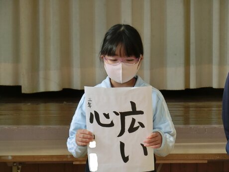 月曜の朝礼で人権集会を行いました。書写の時間にそれぞれの人権に対する思いを込めて半紙に書き込みました。そして、書いた字を示しながら、その字を書いた思いを話してくれました。みんなの思いを大切にしてほしいと思います。また、児童会長からは、「仲間を大切にしましょう」というお話がありました。普段から、人に対してのやさしさや思いやりについて学んでいますが、この人権週間の中で、また意識を高めて生活してほしいと思います。