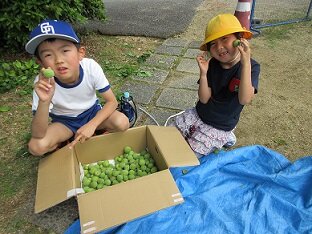 子どもたちに「梅の実で何をつくるの?」と聞いてみると、「梅ジュース」だそうです。梅ジュースづくりのプロの方にお願いして、おいしい梅ジュースをつくるのでしょうね。