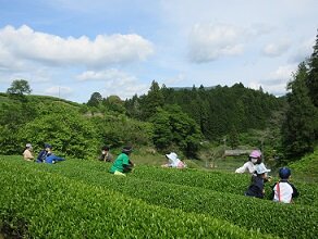 茶業組合の方、保護者の方に参加していただき、本年度も茶摘みができました。昨日を予定していたのですが、生憎の雨でした。今日は雨が上がり、さわやかな初夏の風を感じながら、摘むことができました。