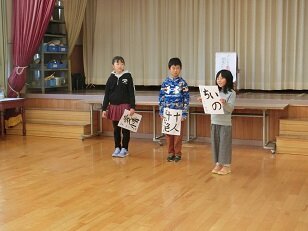 子どもたちは、人権についてのことばを考え、習字にしたためました。そして、そのことばを選んだ理由を発表しました。