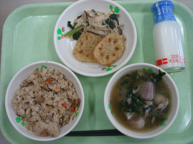 今日の献立は、まいたけごはん、いものこ汁、きのこのソテー、れんこんの磯辺揚げ、牛乳.