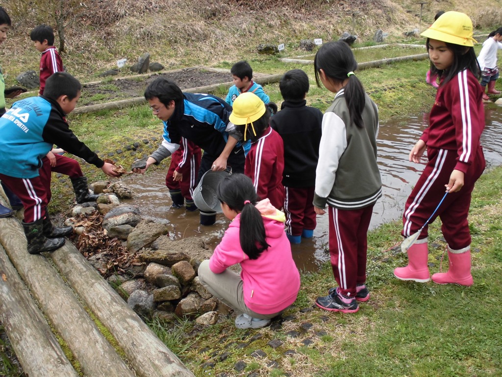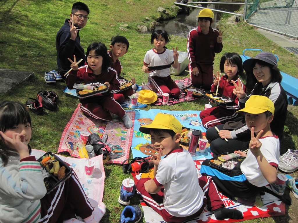 今日の給食は、ふれあい班ごとに外で食べました。「ビオトープの池の近く」や「にこにこ広場」などに陣取り、春の穏やかな日差しのもとで食べるお弁当は格別でした。