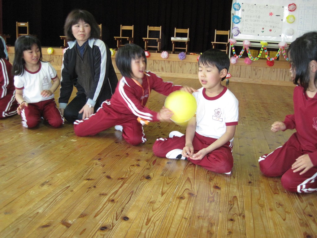 次に、風船を落とさずにどれだけ続けられるかのゲームをしました。1年生の子にもやさしくパスを出していました。続いては、「ゴロゴロストン」というゲーム。鬼が『ストン』といった時にボールを持っていた人が、前に出て自分の好きなことを言うというゲームです。
