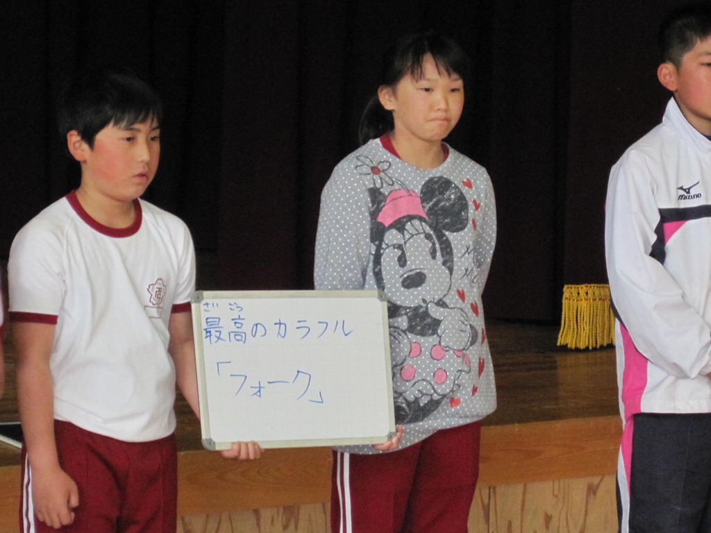 6年生は、「カスタネット」です。カ=下級生を引っ張る6年生、ス=進んで行動する6年生、タ=頼られる6年生、ネッ=粘り強く何度でも挑戦する6年生、ト=友だちと協力する6年生を目指します。