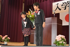 6年生と手をつなぎながらステージからの入場。本校のマスコットキャラクターも旗を振りながら新入生をお出迎えしてくれました。
