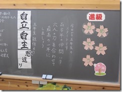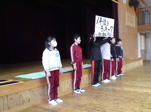5年生(写真右)は、「1年後のラッキー7」です。1年後に幸せに終わりたいと願い、自主・自立・恩送りをモットーにがんばります。