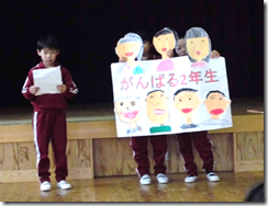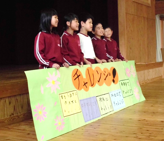 4年生(写真左)は、「チャレンジ」です。あきらめずに何度でもチャレンジ、恥ずかしくてもチャレンジ、元気にチャレンジ、みんなでチャレンジ、最後までチャレンジします。