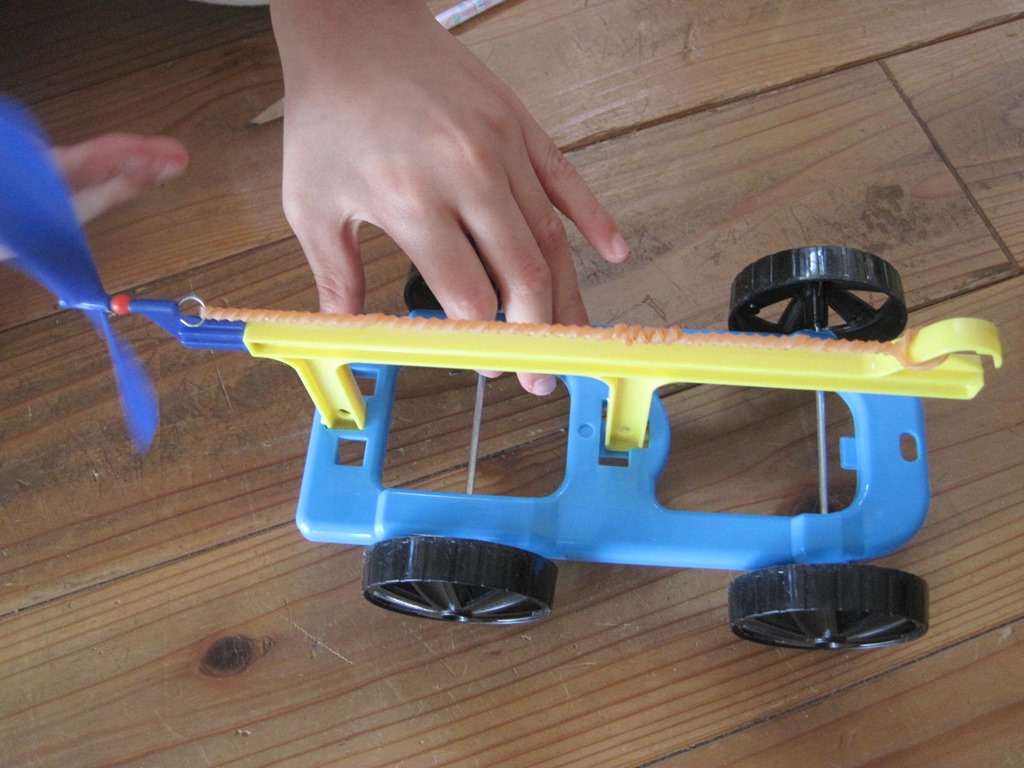 3年生は、「ゴムや風でものをうごかそう」の単元です。プロペラにつなげたゴムをねじって車を動かしてます。70回よりも100回、120回ねじったほうが、より遠くまで走っていきました。「このプロペラを紙飛行機につけたら空を飛ぶかなあ。」と、さらなる意欲をもちました。