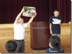 日本青少年赤十字(JRC)主催派遣事業で熊本を訪問した児童が、地震の爪あとを取材した内容の一部を全校児童に報告しました。