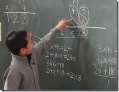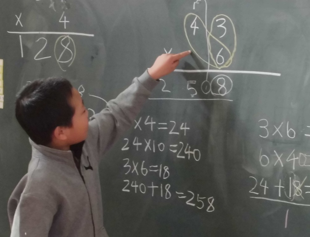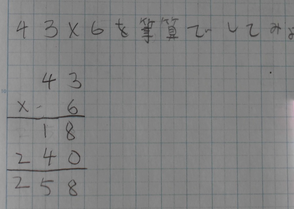 3年生は、算数の授業です。十の位にも百の位にもくり上がる掛け算43×6の筆算に挑戦です。