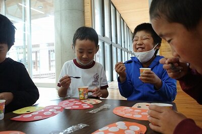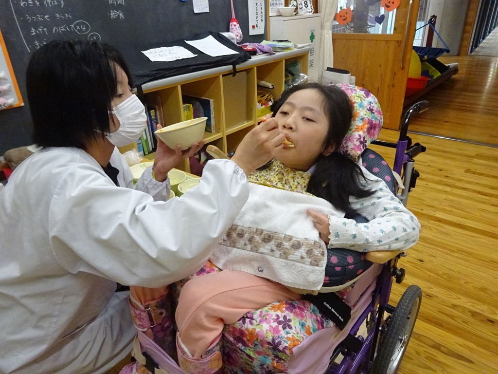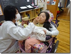 みんな合格したのち、おやつタイムで、いつも食べている牛乳をふるまいました。とろみ剤を使ってあるため、みんながいつも飲んでいるものとは違う食感の牛乳を味わってもらいました。