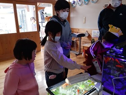 1年生の「びおとーぷすいぞくかん」が開館しました。密を避けるために、予約制で受け付けています。今日は3・4年生がお客さんでした。