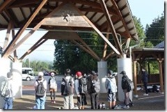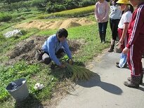 地域の方の田んぼで、地域の方に稲刈りの仕方を教えていただき、鎌を使って刈りました。刈った稲は束ねてはざにかけました。これから2週間干して脱穀します。