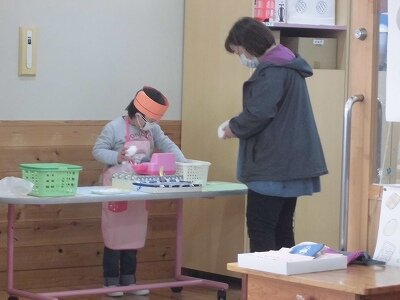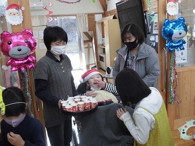 紙皿とお花紙などを使ったクリスマスリースをお客さんに作ってもらいました。作り方は事前に撮っておいた動画で説明しました。そして、普段食べている牛乳(とろみ剤を入れたもの)を味わってもらいました。