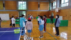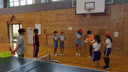 ソフトテニスと卓球に分かれ、郡内各小学校の児童が加わる班を編成し、交流を深めました。