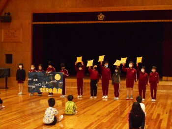延期されていた「1年生を迎える会」が、全児童出席で行うことができました。
