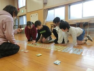 本年度は、昨年度とルールを変更して、なかよし班対抗で行いました。チームでヒントを出したり、声をかけあったりして、取った枚数を競いました。