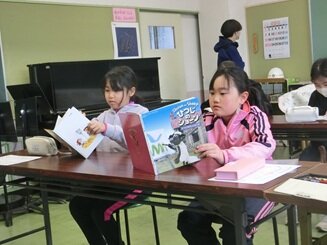 読書タイムを全校で音楽室で行います。一人ずつ、保健室に移動して身体測定をします。保健のめあて「階段大作戦」の振り返りもしています。