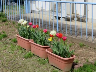 桜は散って、葉桜に。チューリップは満開です。