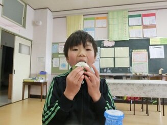 清嶺小では、今日はおにぎり給食でした。給食がはじまったころのメニューを参考に、うめぼしとおかかの具のおにぎりを作って食べました。三角ににぎって、食べている子もいました。