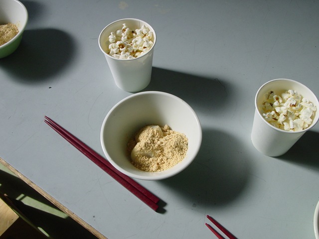 メニューはポップコーン・どら焼き・スイートポテト(お芋)・きなこ餅です。「おやおや、なにかよいにおいがするぞ」、「香ばしい」、「甘いにおいだ」、「どこからにおってくるのだ?」、「感謝の会の準備をしているんだ!」。