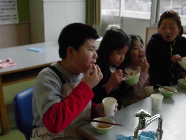 「感謝の会のおやつを作りました。みんな試食に来てください」。高学年のお誘いにのって全校児童が集まり、試食会の始まり始まり。大変好評でした。作った高学年も食べた子どもたちも、みんなニコニコです。「ごちそうさま」。本番でも今日の調子でやりましょう。