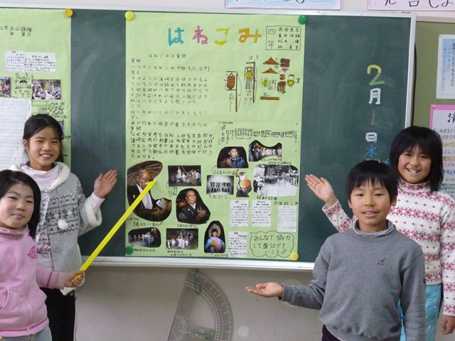 3・4年生が「はねこみ」「田内まつり」について調べました。地域に伝わる伝統行事です。三都橋地区の参候祭ほどの歴史はありませんが、清崎地区・田内地区の方々が大切に守り、伝えようとしている行事です。調べ、発表し、わかった事や感じた事を胸に刻みました。刻まれたことを自分だけではなく、地区の方々にも地域の方々にも伝える活動も積極的に行っていきたいと思っています。