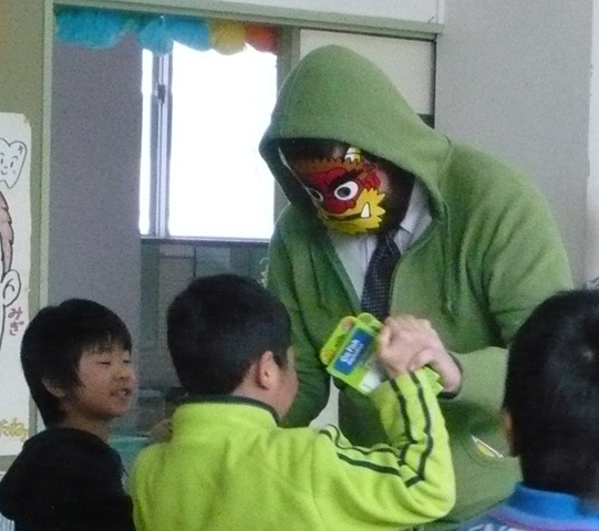 今日3日は節分です。給食のメニューは恵方巻き! 自分で海苔巻きを作って食すところがちょいとしたミソです。「いつもの手巻き寿司とは少し違います。大きな海苔を切らずにそのまま使って巻いてみてください」悪戦苦闘もあったらしいですが、おいしくいただきました。その後すぐに教室には鬼が現れて、さあ始まったぞ『豆 ま き !』 。おお、パトリック鬼もいるぞ!
