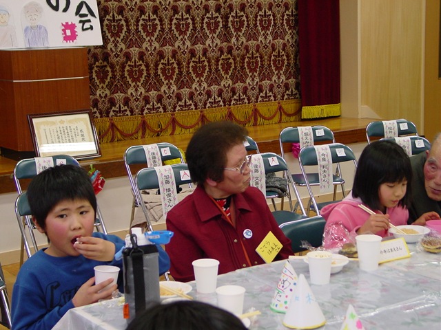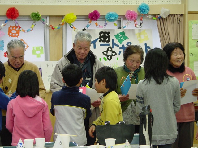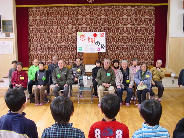 児童会会長あいさつ⇒全校合唱⇒ゲーム⇒お菓子の紹介⇒おやつ会食⇒お礼の言葉・感謝状・絵手紙贈呈⇒地域の方代表のお話⇒校長先生のお話