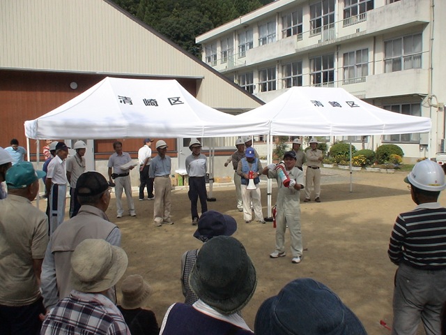 今日は9月最後の日。本校の運動場を利用して学区内の清崎区の防災訓練が行われています。9:30の時点で『気温: 24.4℃ 湿度: 58.2% 降水量: 0.0mm/h 風向: 東北東 風速: 0.9m/s 気圧: 978.1hPa』となっています(インターネット百葉箱のデータ)。天候は晴れで,訓練には全く支障はありません。消火器利用による消火訓練や,地震体験(ナマズ号利用)などが実施されています。区民の方々ばかりではなく,小学生も参加しています。