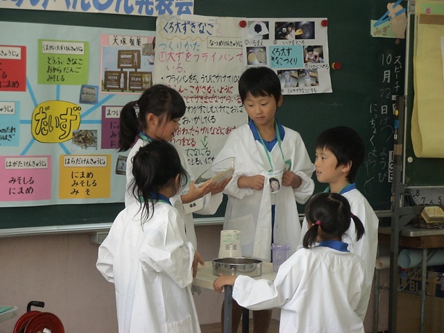 1年生の授業は一言でいえば,栽培の活動を通して生き物・命に触れる学習をしているといえます。植物には立派な命が宿っています。1年生が授業の題材として取り上げた「大豆」にも命があります。大豆は煮豆,豆腐,きな粉,味噌等に姿を変えて私たちの命を支えてくれる一助となっています。大豆の命をいただいて自分の命をながらえることになるわけです。そのように考えると静かに手を合わせて『いただきます』(つつしんで受けたり,ありがたい気持ちを表したりして,物を高くささげる。また,敬って大切にする。 精選版日本国語大辞典-小学館-)と感謝したくなってきました。人は動植物の命を奪わないと生きていけないのですから。