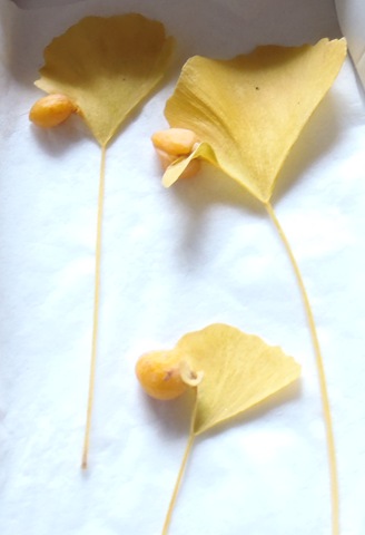 銀杏の木がつけた葉すべてがお葉つきではないのです。たくさんの普通の葉に混じって,わずかな数がお葉つきになっているのです。銀杏の木のそばに行くたびに探していたのですが,これまでは見つけることが出来ませんでした。友人に感謝です。